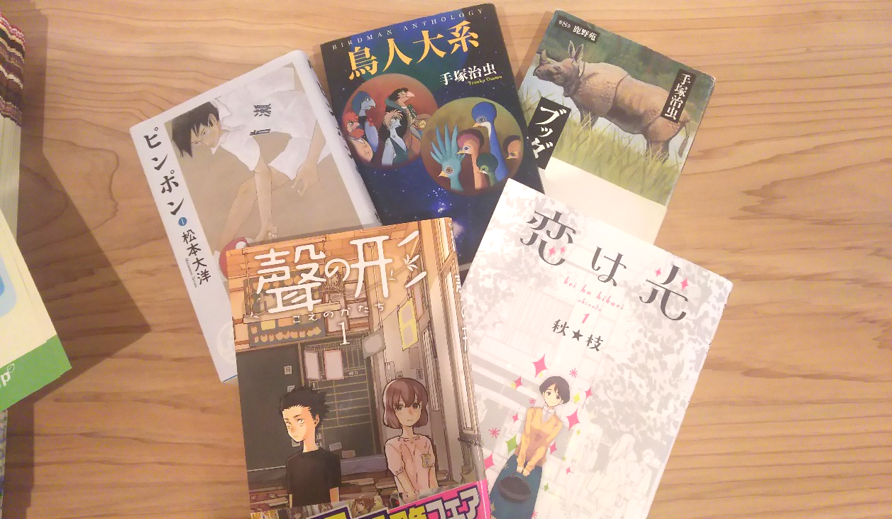 グリンスペースの店先には大きなシェルフがあるのですが、ここにはスタッフ一押しの漫画・雑誌が揃っています。その一部がこちら!