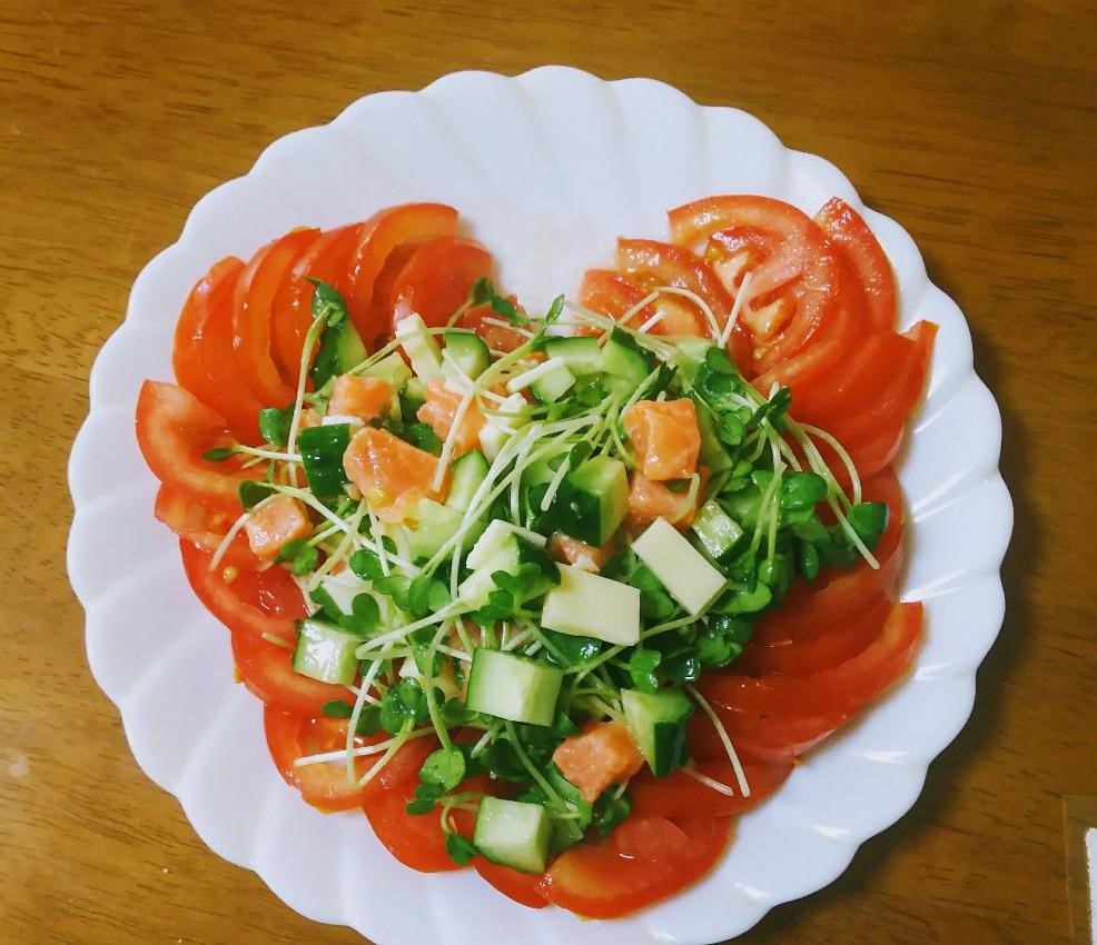 余談ですが、このサラダを作るのに3回ほど試行錯誤し、2回の失敗ではハートではなく太陽の形が出来上がりました。そのためか、先日スーパーの野菜コーナーで「太陽ありますか?」と尋ねてしまったので、、皆さんもお気をつけ下さい。