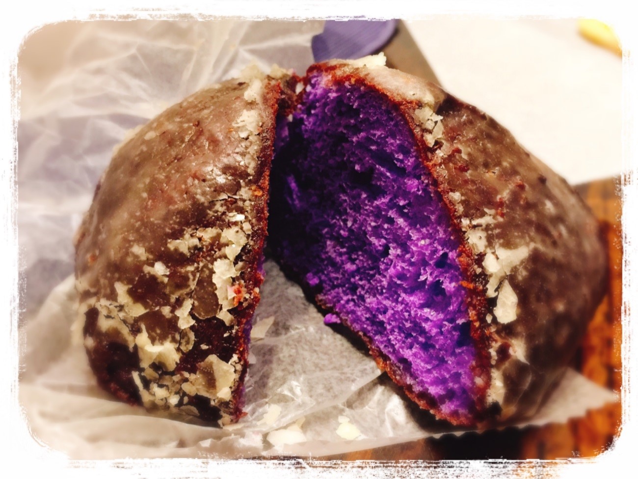 その名もポイ・グレーズド。画像を見ていただければお分かりかと思いますが、外側は砂糖でコーティングされていて(グレーズド)、中は鮮やかな紫色というなんともフォトジェニックなドーナツです。