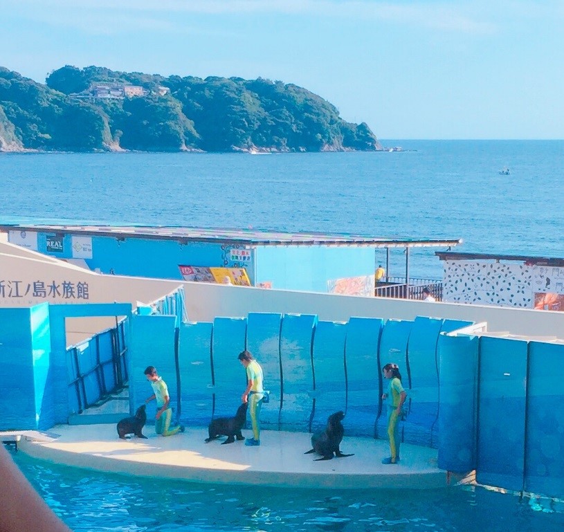 そして海と江ノ島をバックに見るイルカとアシカのショーは大迫力ですごくテンションが上がりました笑。ジャンプの迫力と可愛らしい鳴き声のギャップに萌えること必至です!オススメなのは夕方の時間帯。夕日に照らされた江ノ島と富士山も見えて最高でした✨