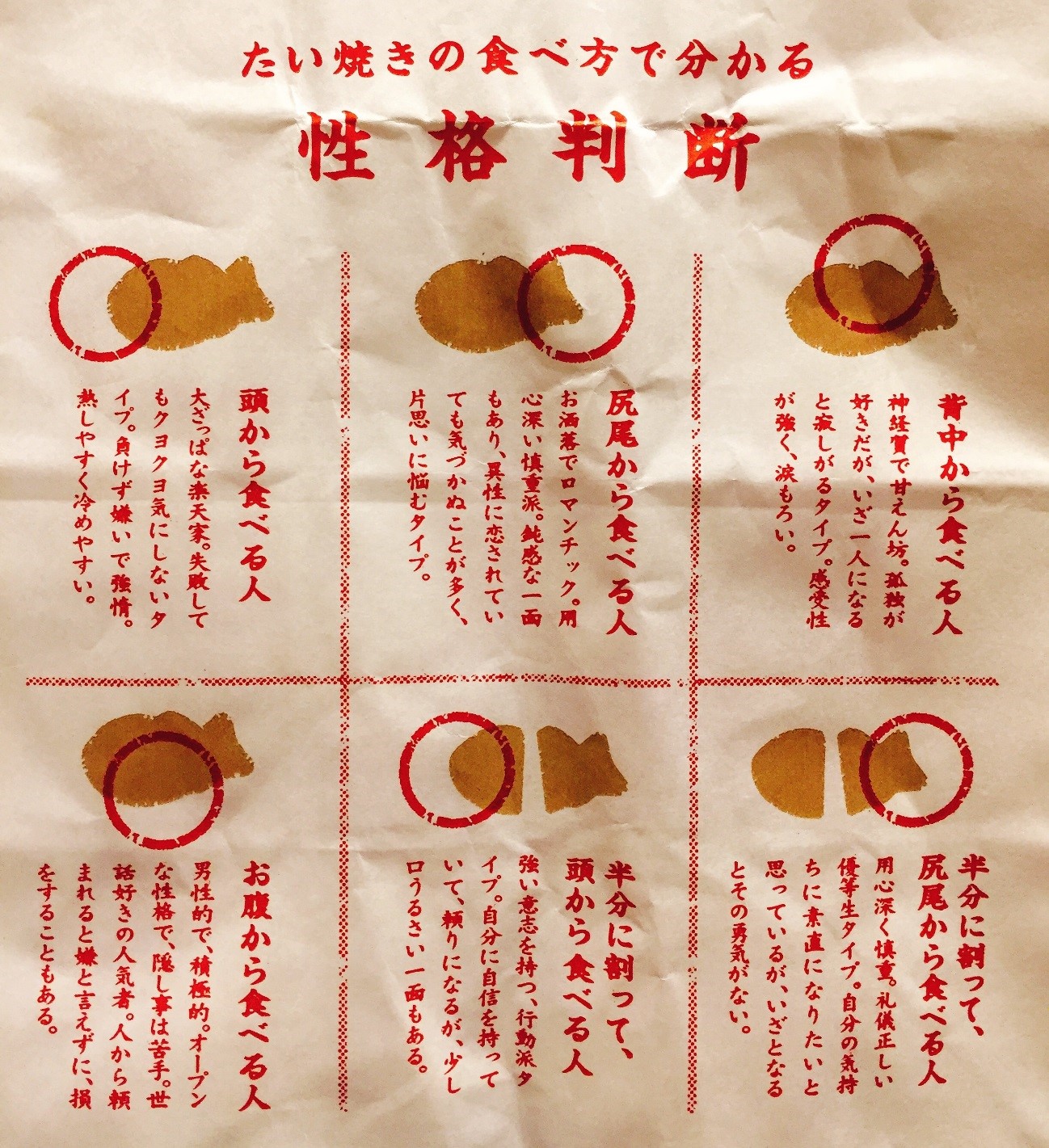 とある鯛焼き屋さんの袋に、鯛焼きの食べ方で分かる性格判断が載っていました。
