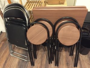 こちらのパイプ椅子7脚と折りたたみテーブル2脚を追加すれば、